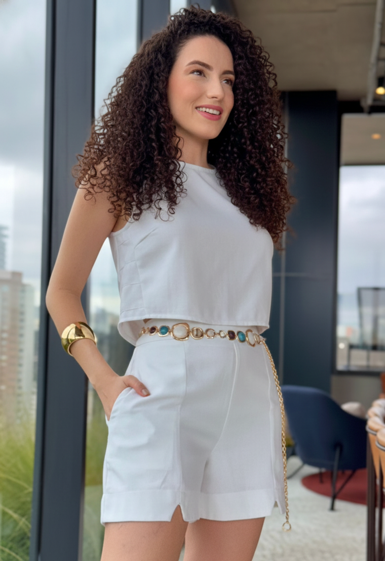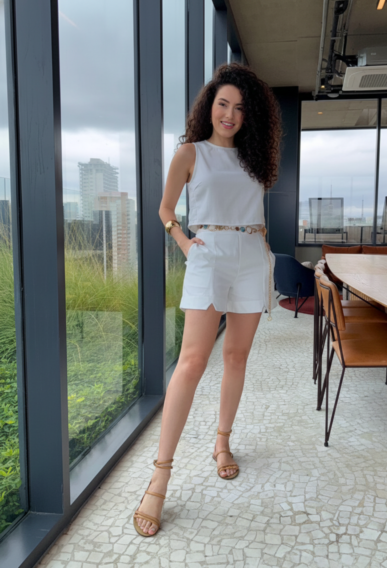 Regata em linho misto, leve e sofisticada, com modelagem atemporal e caimento impecável. O comprimento médio oferece versatilidade para diversas composições, enquanto o detalhe lateral em pregas adiciona um toque sutil de elegância. O fechamento traseiro conta com um delicado botão da mesma cor do tecido, garantindo um acabamento harmonioso e discreto. Perfeita para compor looks frescos e elegantes em qualquer ocasião.